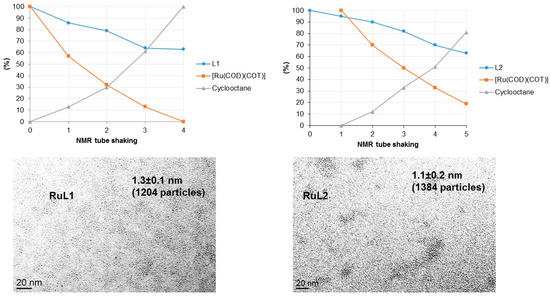 Graphical representations of the data corresponding to the consumption of ligand and [Ru(COD)(COT)], and formation of cyclooctane (top); TEM images of RuL1 and RuL2 after total consumption of [Ru(COD)(COT)] (bottom).
