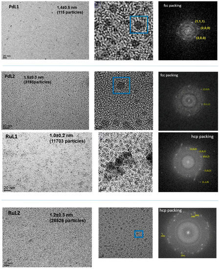 With this information, PdNPs and RuNPs were synthesised at a larger scale, using now a metal/ligand ratio of 1/0.6 and 1/0.4, respectively, preserving the conditions previously described (see above, Scheme 1). Under these conditions, PdNPs with a mean diameter of ca. 1.5 nm for both ligands were obtained (Figure 4). Electronic diffraction analyses of these PdNPs showed a fcc structure as expected for bulk Pd(0) and the corresponding EDX (Energy dispersive X-ray spectroscopy) data evidenced the presence of ligand in the as-prepared nanoparticles (see Figure S8 in the Supplementary Materials). Elemental analyses indicated that the Pd/L ratio found on the isolated PdNPs was: Pd/L1 = 1/0.27 and Pd/L2 = 1/0.50 (corresponding to a ratio Pd/L at the surface PdL10.4 and PdL20.8). Concerning RuNPs, small nanoparticles were also obtained, with a mean diameter of 1.0 and 1.2 nm for RuL1 and RuL2, respectively. Their electronic diffraction analyses exhibited a hcp arrangement characteristic of bulk Ru(0); the corresponding EDX data confirmed the presence of the ligand in the as-prepared materials. Elemental analyses indicated that the Ru/L ratio found on the isolated RuNPs was: Ru/L1 = 1/0.56 and Ru/L2 = 1/0.46 (corresponding to a ratio Pd/L at the surface PdL10.4 and PdL20.8).