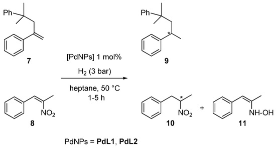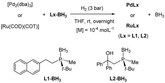 We prepared palladium (PdLx) and ruthenium (RuLx) nanoparticles (Lx = L1 or L2, Scheme 1), containing optically pure borane-protected phosphines, (S)-tert-butylmethyl(2-(2-naphthyl)ethyl)phosphine-borane (L1-BH3) [35] and (R)-(2,2-diphenyl-2-hydroxyethyl)-P-methyl-tert-butyl-phosphine-borane (L2-BH3) [36], as stabilisers. Based on the literature [37,38,39], MNPs were synthesised by organometallic complex decomposition in the presence of the corresponding ligand (L1 or L2) using a metal/ligand ratio of 1/0.2, under hydrogen atmosphere (3 bar); [Pd2(dba)3] (dba = dibenzylideneacetone) and [Ru(COD)(COT)] (COD = 1,5-cyclooctadiene; COT = 1,3,5-cyclooctatriene) were chosen as organometallic precursors (Scheme 1).