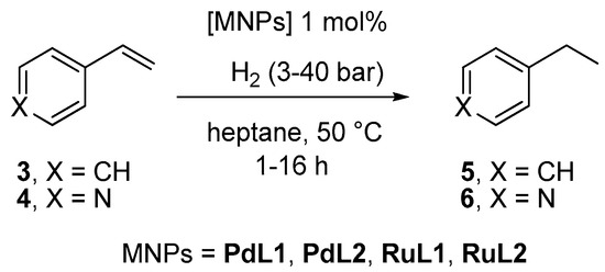Hydrogenation of styrene (3) and 4-vinylpyridine (4) catalysed by Pd- and Ru-based catalysts.