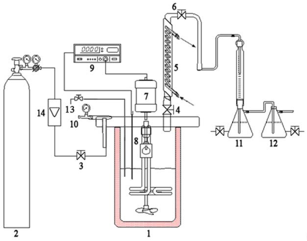 The scheme of the reaction system is shown in Figure 8. The reactor was a stainless steel VT = 500 mL autoclave with electric heating and dynamoelectric stirring. This apparatus was equipped with a back-pressure regulator (6), a sampling valve (13), a condenser (5), and a temperature and stirring speed controller (9). A filter was fixed at the end of the sample tube in the reactor, to prevent the heterogeneous catalyst from leaving the reactor during on-line sampling.