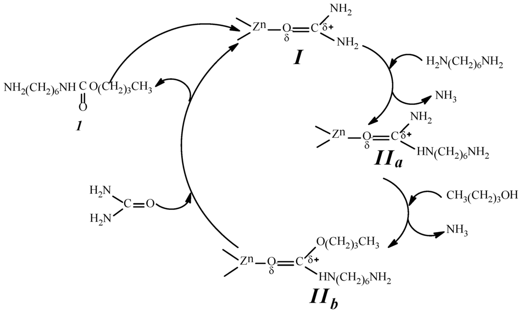 It must be noted that the species IIa may react with not only another molecule of urea at the Lewis acid site Znδ+, to form the reaction intermediate product 5 [12,24], but also a nucleophile alcohol at the carbonyl carbon to form 1 (Scheme 2) [16,27]. In addition, as the nucleophilic ability of 1,6-hexanediamine is much stronger than that of butanol, the target product 2 is much harder to synthesize than the intermediate product 5.