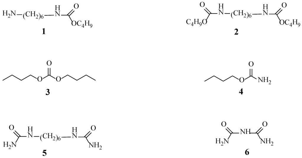 The product mixtures of the one-pot synthesis of dibutyl hexane-1,6-dicarbamate (2) from HDA, urea and butanol were analyzed using a Varian Saturn 2200 GC/MS spectrometer equipped with a 15 m × 0.32 mm CP-Wax 52CB fused Silica capillary column and a flame ionization detector (FID). The result of analysis showed that a few byproducts/intermediates, such as, 1 (butyl 6-aminohexyl-1-carbamate), 3 (dibutyl carbonate), 4 (butyl carbamate), 5 (hexane-1,6-diurea) and trace 6 (biuret) were also generated [12,20], in addition to the desired product 2 (dibutyl hexane-1,6-dicarbamate). The structural formula of the products for the one-pot synthesis of 2 from HDA, urea and butanol is shown in Chart 1.