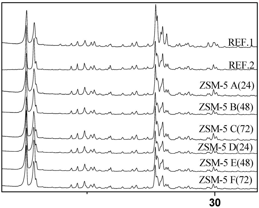 Diffraction patterns for the different zeolites: Ref. [1] series and Ref. [2]. series Zeolite synthesized for 24 h; NaOH 0.1 mol/L (ZSM-5 A(24)); for 48 h; NaOH 0.1 mol/L (ZSM-5 B(48)); for 72 h NaOH 0.1 mol/L (ZSM-5 C(72)); for 24 h; NaOH 0.5 mol/L (ZSM-5 D(24)); for 48 h; NaOH 0.5 mol/L (ZSM-5 E(48)); for 72 h; NaOH 0.5 mol/L (ZSM-5 F(72)).