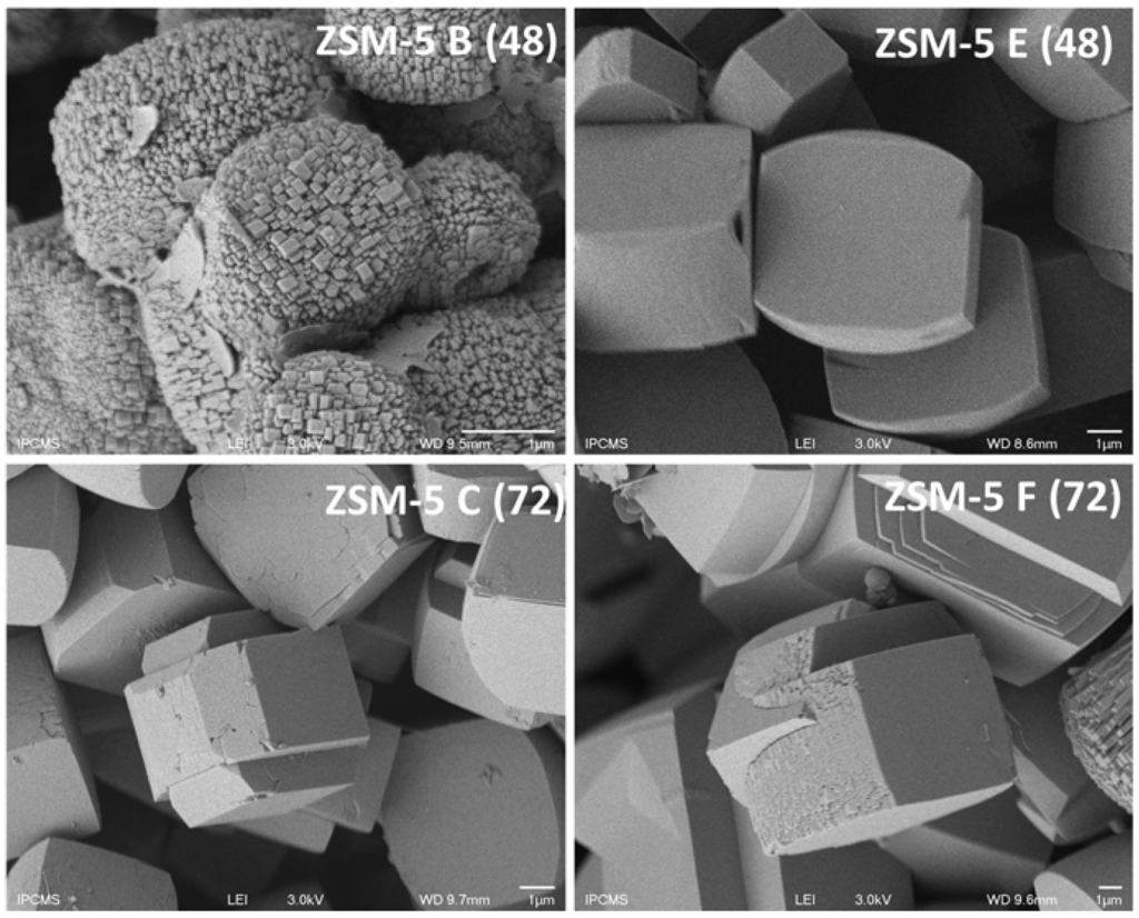The SAR based on the bulk composition was remarkably affected and values in the range of 25 to 150 were measured. Microporosities and mesoporosities are rather similar for all zeolites in line with literature data [22,23]. For the sake of clarity, a parent ZSM-5 was characterized by the nitrogen adsorption/desorption technique and similar microporous volumes were measured. ZSM-5 prepared in the presence of biomass derived-compounds exhibited a slightly lower mesoporous volume compared to its parent ZSM-5 counterpart. The ZSM-5 structure is orthorhombic (Pnma space group) when high thermal treatment is conducted [24,25], usually resulting in prismatic crystal formation [26] as observed for reference zeolites (Figure 2). The standard method used for preparing ZSM-5 zeolite resulted in 1-3 µm range crystal size with no changes in morphology with ageing time. In contrast, both morphology and particle size were affected by the presence of biomass derived-compounds. The extract obtained at 0.1 mol/L led to regular (size and type) ZSM-5 crystals at an ageing time of 24 h. A further raise in ageing time to 48 h led to the formation of crystals having the same size, but extremely different in terms of morphology that was constructed by an assembly of elongated French-fries having 100 nm in width. At longer ageing times, larger crystals were formed, exhibiting again a conventional morphology. In contrast to ZSM-5 A(24) sample, ZSM-5 C(72) sample exhibits sharper crystal outer rim and appears to be more faceted. While studying the influence of alkali cation nature and gel ionic strength, Petrik et al. were able to synthesize MFI zeolites with significant changes in morphology and drawn the conclusion that minor alterations of the composition may lead to major changes in the crystal growth [27].