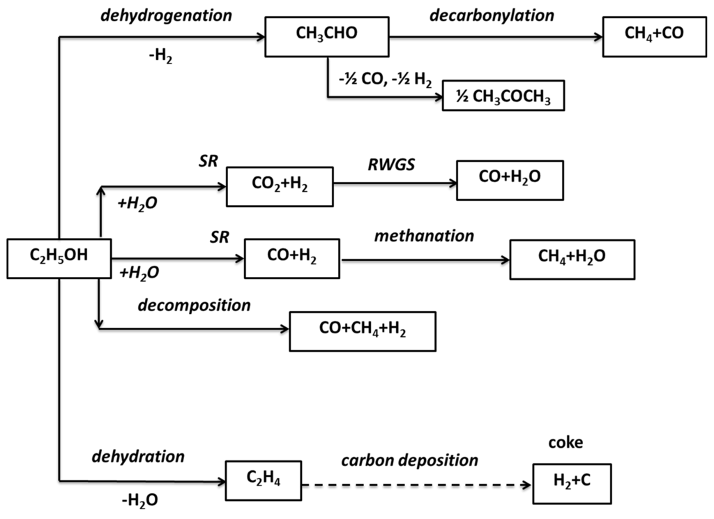 - Fatsikostas, A.N.; Verykios, X.E. Reaction network of steam reforming of ethanol over Ni-based catalysts. J. Catal. 2004, 225, 439–452. [Google Scholar] [CrossRef]