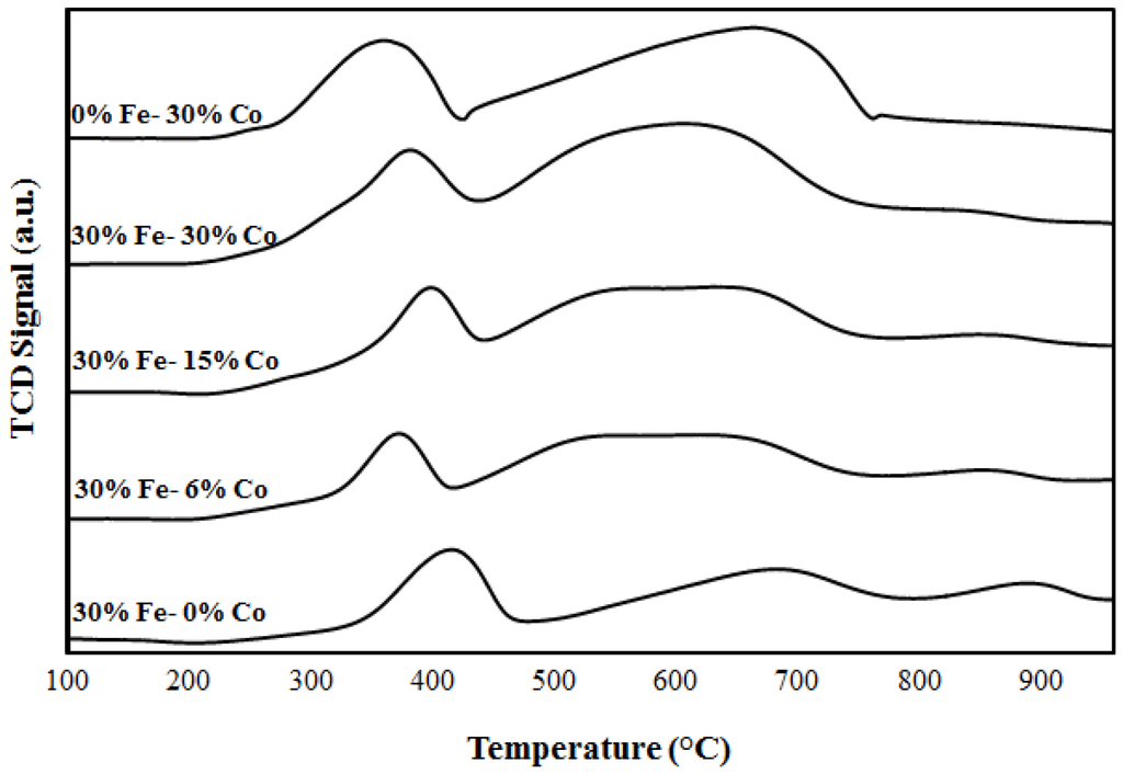 TPR profiles for Fe, Co, and Fe-Co catalysts.