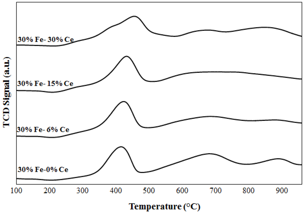 Micromeritics (Auto Chem II 2920 apparatus, Norcross, GA, USA) was used to study the TPR/TPO measurements using 70 mg for each sample. The pretreatment under high purity Argon flow was carried out at 150 °C for half an hour. Then, the samples were cooled down to room temperature. Finally, furnace temperature was raised at 10 °C/min to 1000 °C under 40 mL/min flow rate of H2/Ar mixture containing 10 vol. % of H2. The signals of H2 consumption were monitored by a thermal conductivity detector (TCD).