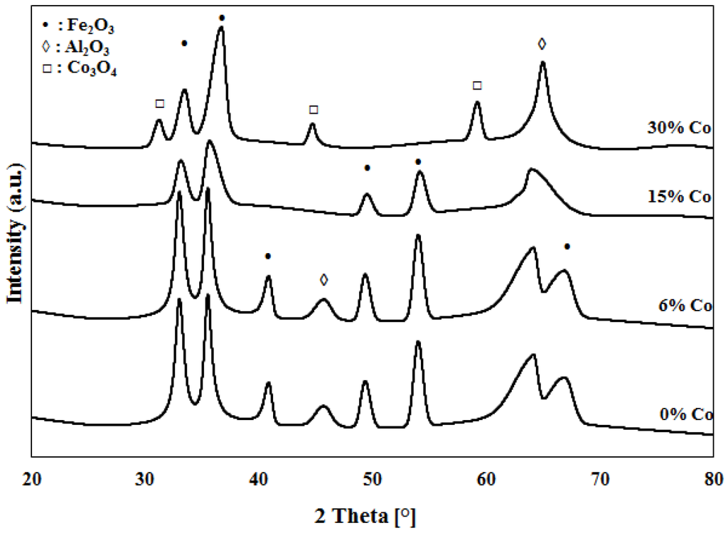 Avdeeva et al. [] investigated the performance of Fe/Al2O3 and Fe-Co/Al2O3 using a fixed bed reactor to study the carbon deposited from methane decomposition. They concluded that Fe/Al2O3 carbon capacity has increased when Co is added. The catalyst carbon capacity has increased remarkably by adding 6%Co to 50%Fe/Al2O3 from 26.5 to 52.4 g/gcat. Introducing Co to Fe catalyst has affected Fe crystal formation which facilitate Fe reduction []. Fe-Co spinel was confirmed containing cobalt ferrites [,].