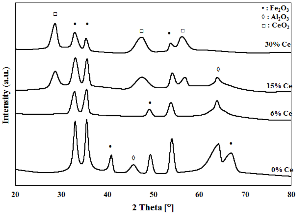 XRD patterns for calcined 30%Fe-X%Co/Al2O3 and calcined 30%Fe-X%Ce/Al2O3 catalyst are presented in Figure 3 and Figure 4, respectively. A similar pattern has been observed for 30%Fe/Al2O3 and 30%Fe-6%Co/Al2O3 samples, which indicates that the addition of a small amount of Co to Fe does not have an effect on the crystal lattice of 30%Fe/Al2O3. Figure 3 illustrates a remarkable change in the crystal lattice of 30%Fe/Al2O3 when Co is added at a ratio of ½ or higher to iron (30%Fe-15%Co/Al2O3 and 30%Fe-30%Co/Al2O3). However, a dramatic change is observed with the crystal lattice of 30%Fe/Al2O3 due to Ce addition, even when added in small amounts, 30%Fe-6%Ce/Al2O3, as shown in Figure 4.