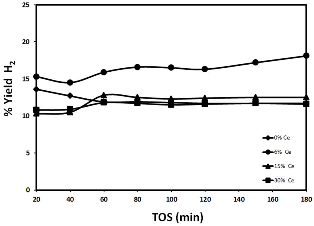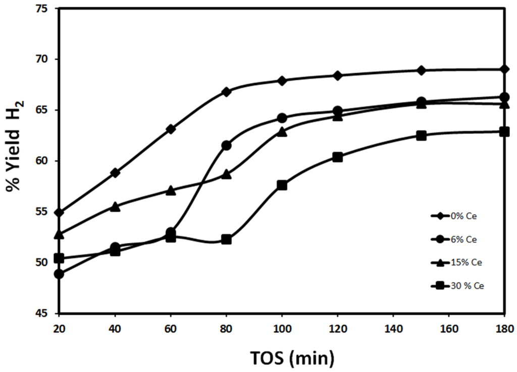 Generally, a steady increase in H2 yield was observed for all 30%Fe-X%Ce/Al2O3 catalysts. The improvement of catalyst performance is attributed to the insufficient reduction duration at 500 °C especially for Fe sites. By releasing more hydrogen because of methane cracking, a better reduction of the catalyst sites can be achieved. The negative effect of Ce addition could be explained by a reduction in active sites subjected to the reaction due to sintering.