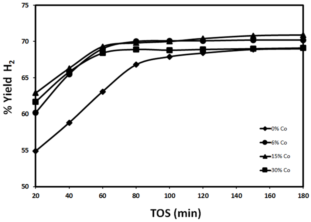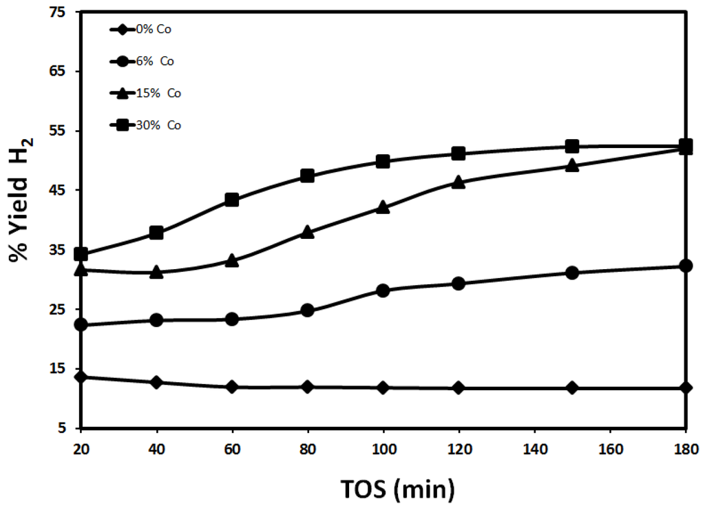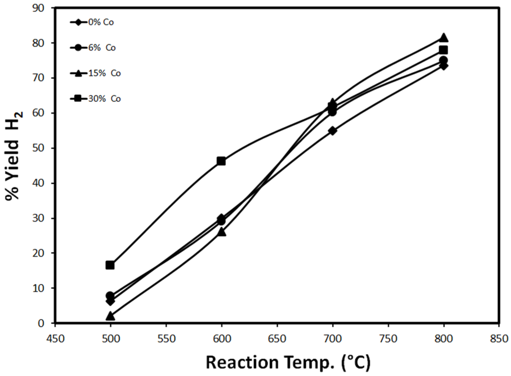 Figure 11 shows the effect of temperature on H2 yield, using 30%Fe-X%Co/Al2O3 catalysts 20 min after the onset of the reaction. For all loadings of 30%Fe-X%Co/Al2O3, H2 yield experienced almost a linear dependency on temperature. H2 yield increases with temperature since the reaction rate is expected to increase with temperature [,,,,]. The highest H2 yield is observed with 30%Fe-30%Co/Al2O3 at 700 °C and below. Higher than 700 °C, H2 yield is slightly suppressed with 30%Fe-30%Co/Al2O3. For other 30%Fe-X%Co/Al2O3 catalysts, H2 yield exhibits a linear increase over the temperature range 500–800 °C. The results have shown that sintering does not play a major role at higher temperatures with 30%Fe-X%Co/Al2O3. The results reveal the positive contribution of Co for Fe catalyst due to the increased thermal stability of Fe/Al2O3 when Co is added.