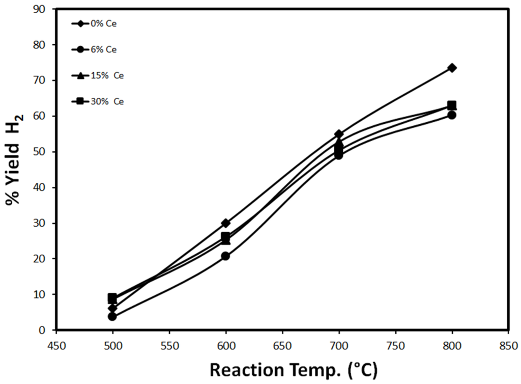 H2 yield as a function of temperature for different loadings of Ce (reduced at 500 °C).