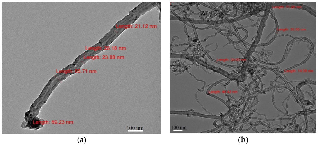 The deposited carbon on 30%Fe-15%Co/Al2O3 is studied using TEM, and the deposited carbon is found only as carbon nano-tubes as shown in Figure 12a,b. The TEM images (Figure 12a,b) have indicated that active sites are still on the tip of carbon nano-tubes without formation of encapsulating carbon. The carbon nano-tubes’ diameter varies from 14 to 73 nm, which may indicate the presence of single walled and multi-walled carbon nano-tubes. The inner diameter of carbon nanotubes varied along the nano-tube length from 13 to 26 nm.