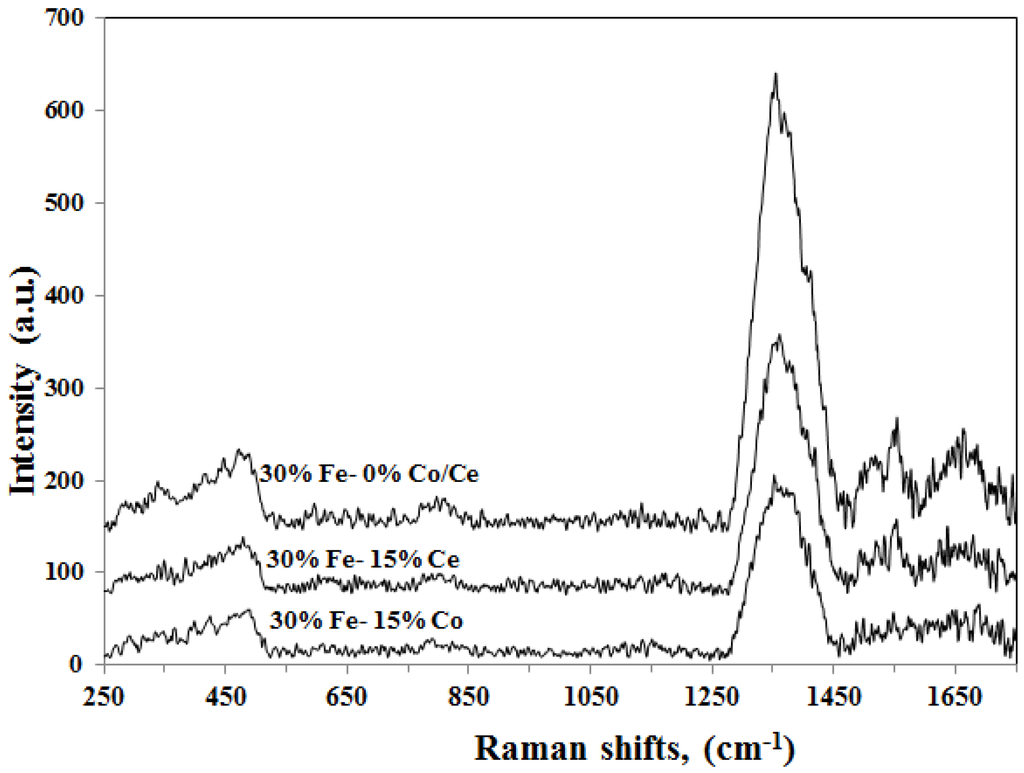 The Raman spectra of the spent catalysts are shown in Figure 13. A similar spectrum has been observed for the three catalysts 30%Fe/Al2O3, 30%Fe-15%Co/Al2O3, 30%Fe-15%Ce/Al2O3, which supports our speculation based on XRD and TPR results since there is no evidence of formation of any chemical compounds between Fe and Co/Ce. The used catalyst samples were reduced at 500 °C and subjected to a reaction at 700 °C for 180 min. A weak Raman band is observed at 475 cm−1 corresponding to Fe2O3 [,,,]. The presence of such bands for Fe2O3 indicates the insufficient treatment during reduction. The observed Fe2O3 band showed lower intensity when Fe mixed with Co/Ce indicating the effect of promoting Fe/Al2O3 with Co/Ce.