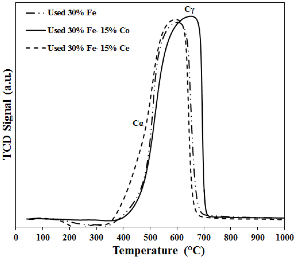 In order to find the nature of carbon deposition on spent catalysts, TPO experiments were performed. The catalyst samples under study were used previously in the catalytic methane decomposition reaction at 700 °C and 180 min. The samples were dried out at 150 °C for 30 min, under helium (He) flow (30 mL/min) and cooled down to room temperature, followed by an increase of temperature under O2/He (30 mL/min) flow with a temperature ramp of 10 °C/min to 1000 °C.