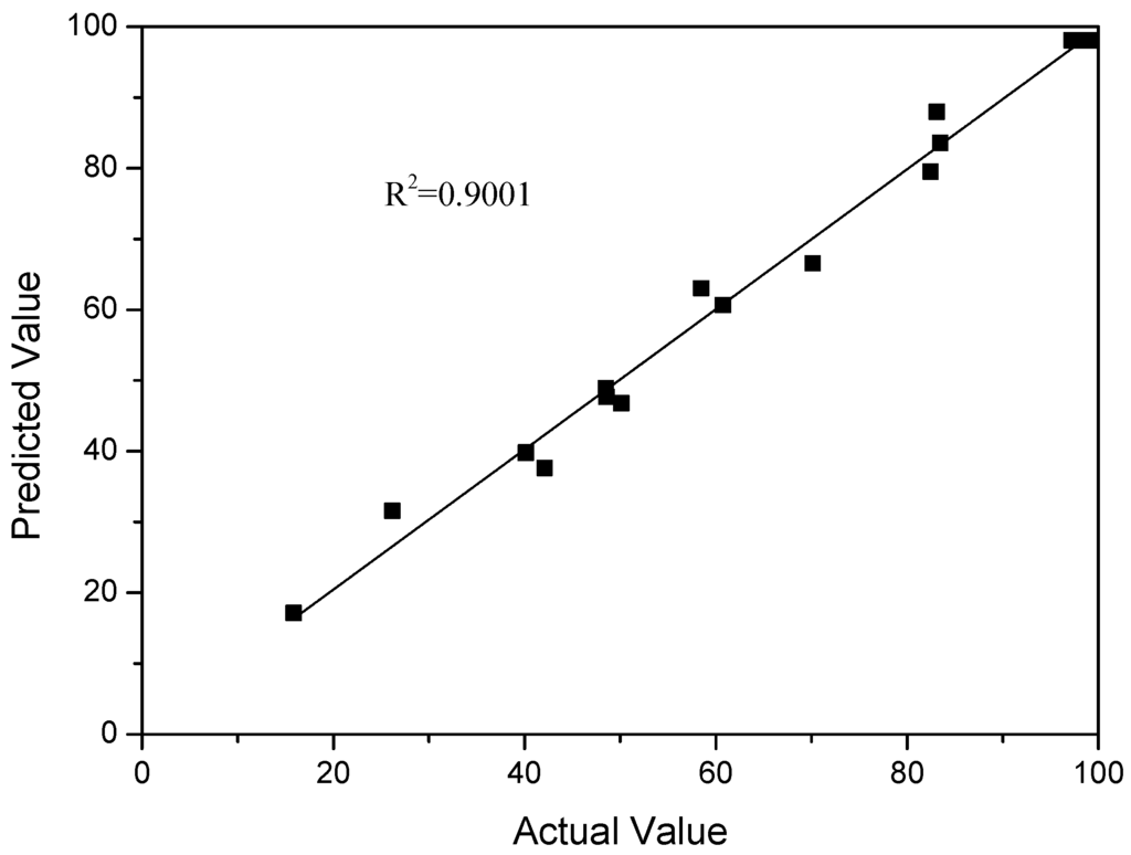 The similarity between the predicted and actual values is described in Figure 4. The coefficient of determination (R2) value was 0.9001, indicating a close agreement between the experimental and theoretical values.