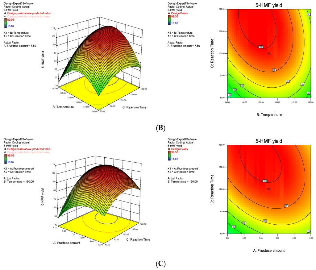 Response fitted surface area and contour plot for 5-HMF yield based on (A) temperature and fructose loading; (B) reaction time and temperature and (C) fructose loading and reaction time.