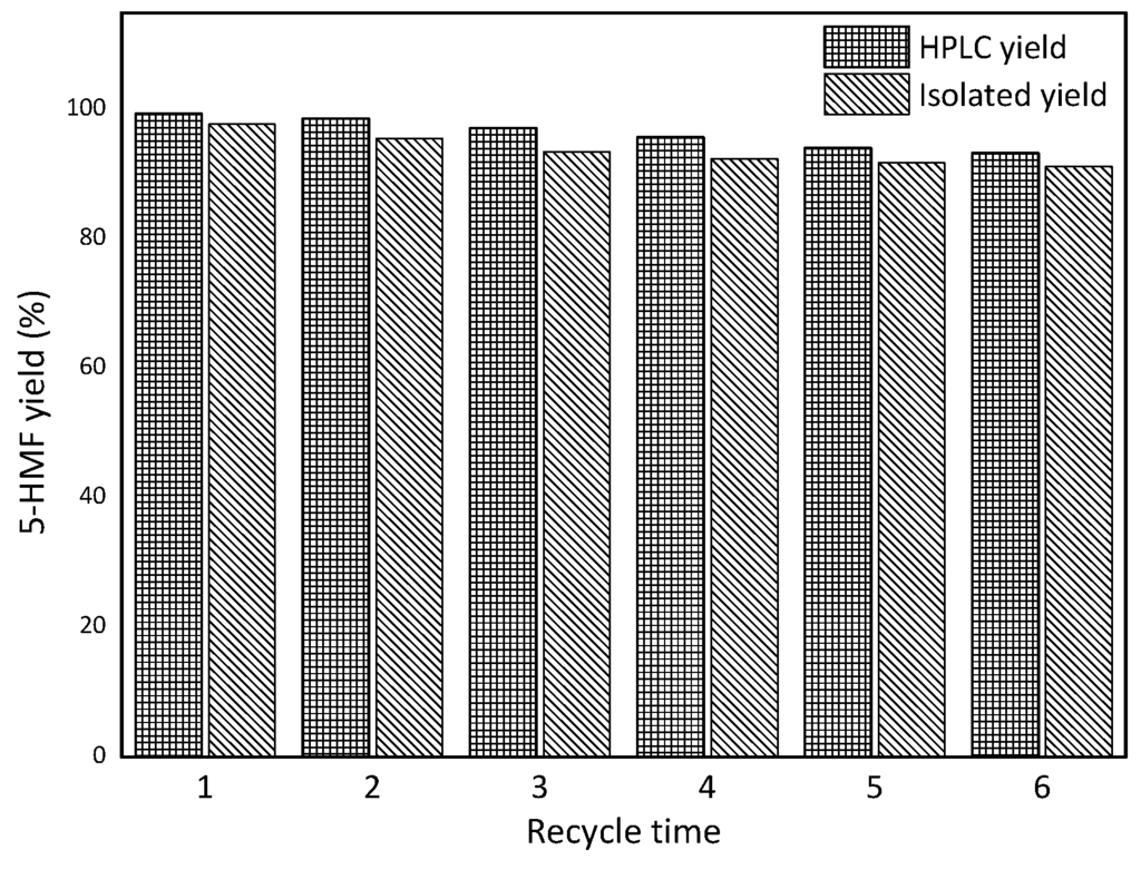 After the reaction, the mixture was distilled and collected to pure sec-butanol. The remaining mixture was extracted with ethyl acetate after the addition of 0.5 mL water according to the procedure reported previously. CePW12O40 and sec-butanol were recycled at least six cycles without significant loss of activity and the yield of 5-HMF was still 93.3% after six runs (Figure 6). The slight decrease in 5-HMF yield could be ascribed to the intensive formation of humins during the reaction; this could be observed from the viscous solutions produced after long reaction times.
