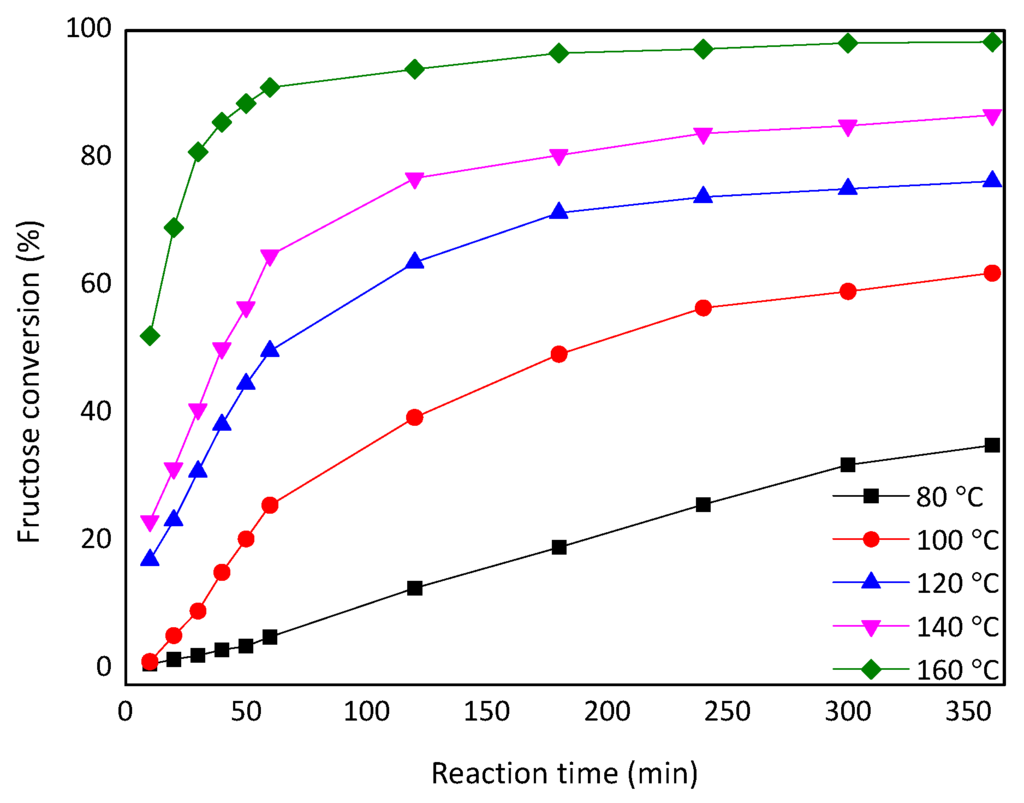 Fructose conversion when increasing the temperature from 80 to 160 °C.