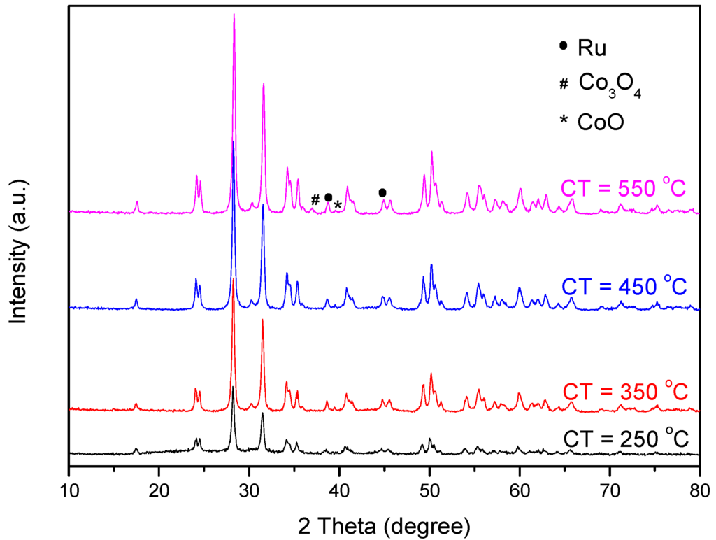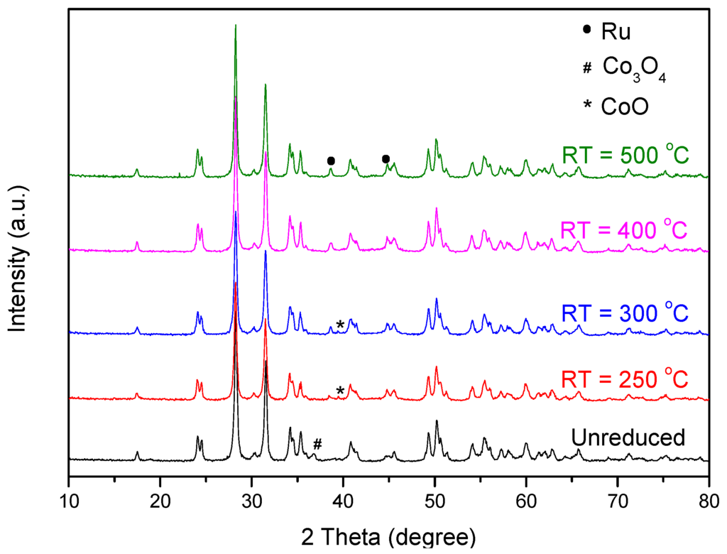 In addition, the phase of metallic Ru (2θ = 38.5°) appeared in all the reduced catalysts, which indicates that ruthenium oxides are more easily reduced. The Co3O4 phase (2θ = 36.9°) only existed in the unreduced sample, but CoO (2θ = 39.5°) presented in the samples reduced at 250 °C and 300 °C. This implies the reduction of Co3O4 is a two-step process, which corresponds to the reduction of Co3O4 to CoO, and then the reduction of CoO to metallic Co. No obvious diffraction peaks of metallic Co (the strongest diffraction peak at 2θ = 47.4°, JCPDS Card #89-7373) can be observed in the XRD patterns, probably because the Co particles are too small to be detected.