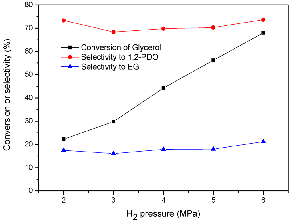 Figure 7 shows the effect of hydrogen pressure on the catalytic performance of Ru-Co/ZrO2. The hydrogen pressure dramatically influenced the glycerol conversion, while it only slightly affected the product selectivity. The conversion of glycerol increased monotonously with increasing hydrogen pressure. The solubility of hydrogen in water is proportional to the hydrogen pressure [36]. Therefore, the increasing glycerol conversion may be caused by the enhanced concentration of hydrogen in the aqueous solution with increasing pressure. Similar results have been obtained over other catalysts such as Co/MgO [14].