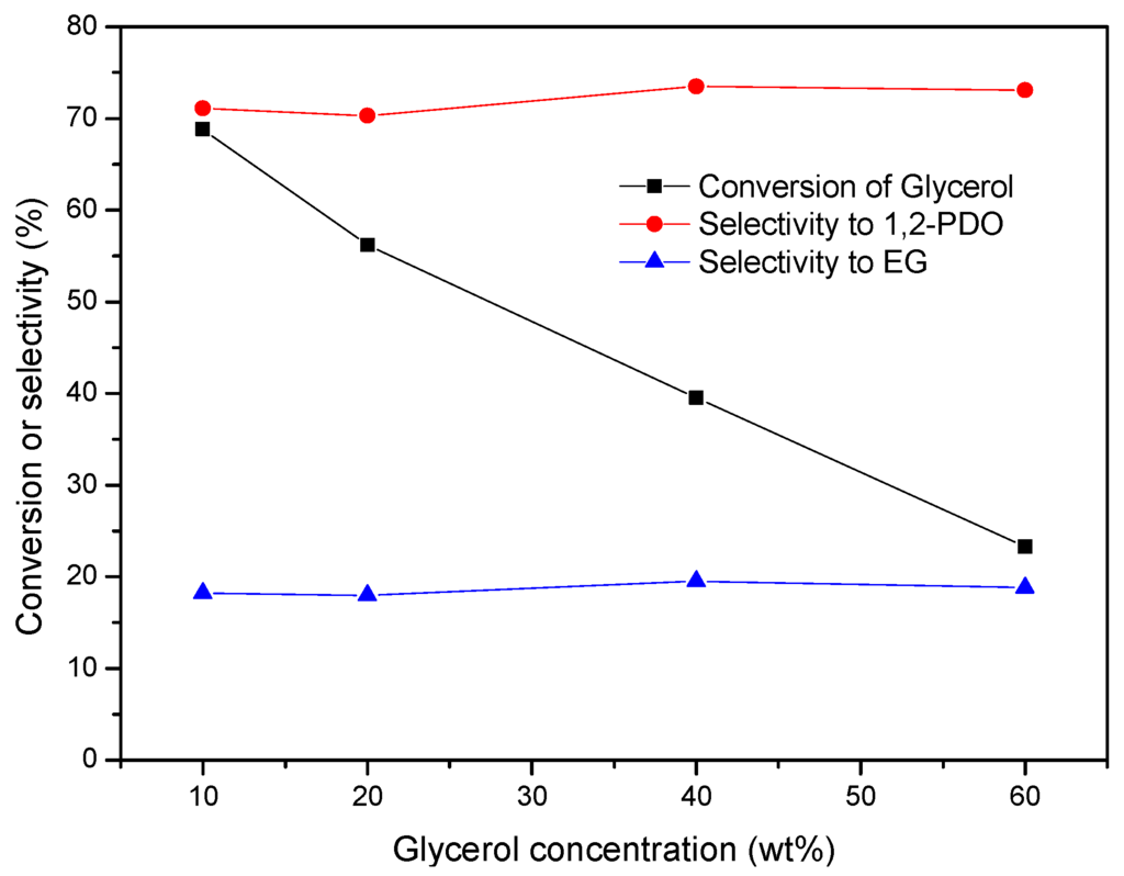 As we know, glycerol is a liquid with high viscosity. Overhigh concentration of glycerol will cause substrate diffusion problems because of the mass transfer limitation [21]. The effect of glycerol concentration on the catalytic performance of Ru-Co/ZrO2 is presented in Figure 8. As the glycerol concentration increased, the conversion of glycerol decreased. This changing tendency is easy to understand: the substrate amount increases with increasing glycerol concentration, while the available number of catalytic sites (i.e., the amount of catalyst) is constant. Interestingly, the selectivities to 1,2-PDO and EG were almost unchanged with the change in glycerol concentration, which is in accord with previous findings over monometallic Ru [37,38] and Co [14] catalysts.