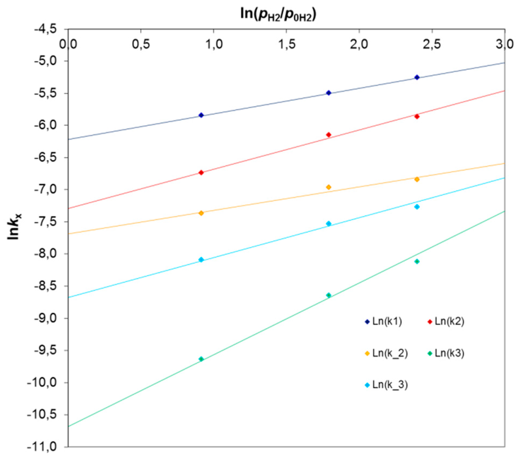 In all cases, very good values of R2 coefficients in the range of 0.98–1.00 were obtained. The reaction orders (n exponent) with respect to hydrogen were in the range of 0.35 to 1.1. These values are consistent with literature reports indicating that the rates of dienes to monoenes hydrogenation and the cis/trans monoenes isomerization are half order with respect to the hydrogen concentration [], while the hydrogenation reaction of monoenes follows first-order kinetics []. Other authors [] arrive at the first order in hydrogen for dienes and an order of 3/2 for monoenes when hydrogenating in the gas phase.