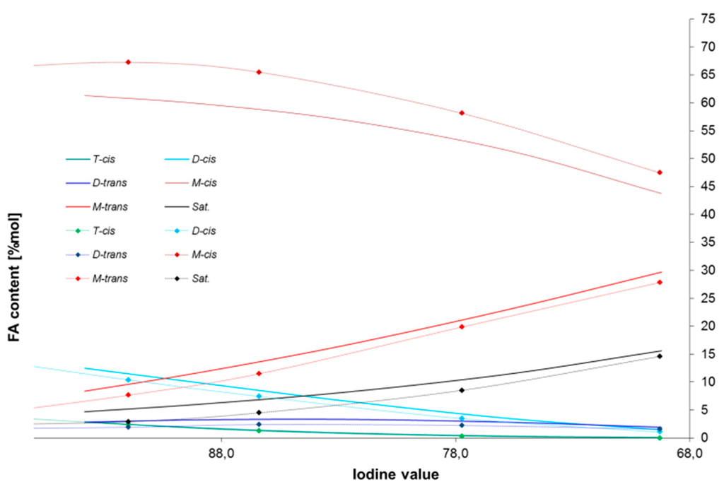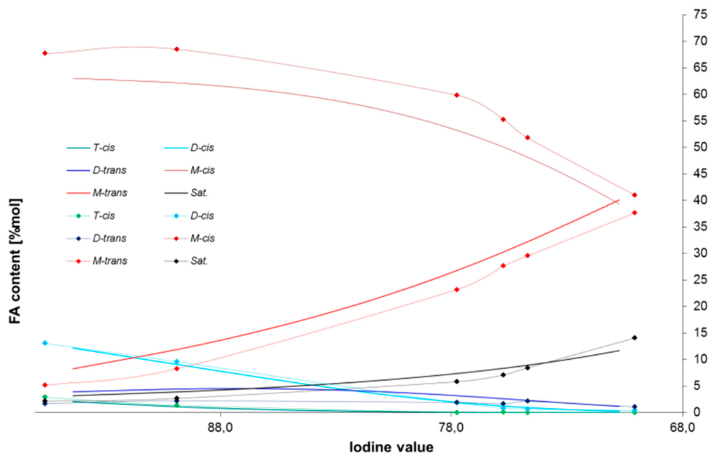 - Musavi, A.; Cizmeci, M.; Tekin, A.; Kayahan, M. Effects of hydrogenation parameters on trans isomer formation, selectivity and melting properties of fat. Eur. J. Lipid Sci. Technol. 2008, 110, 254–260. [Google Scholar] [CrossRef]