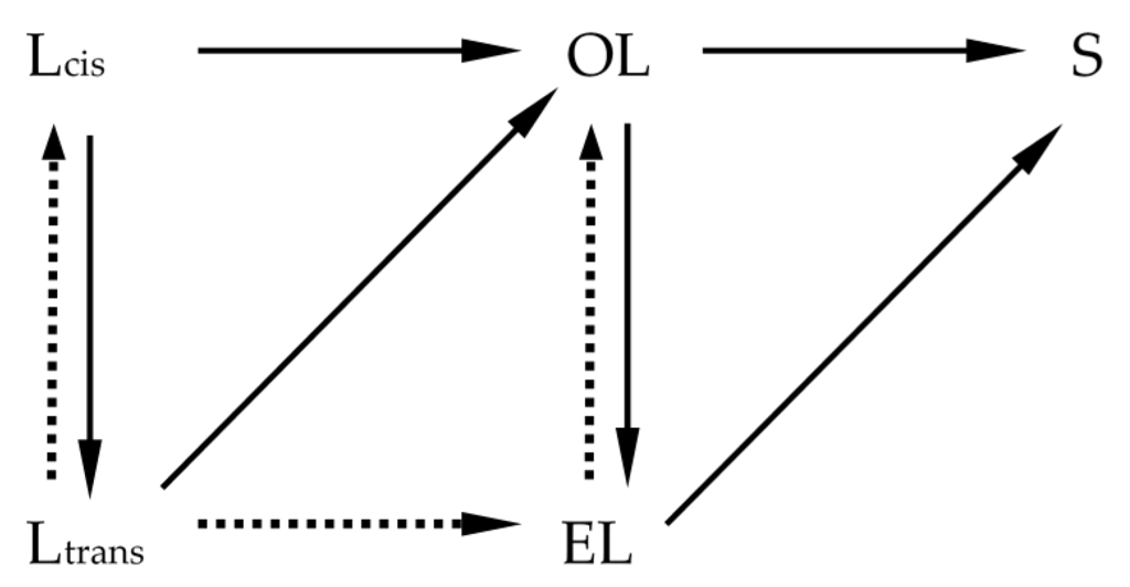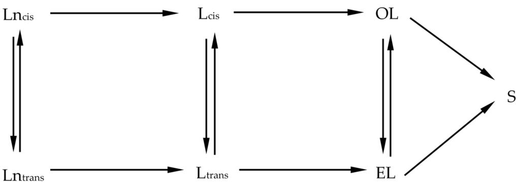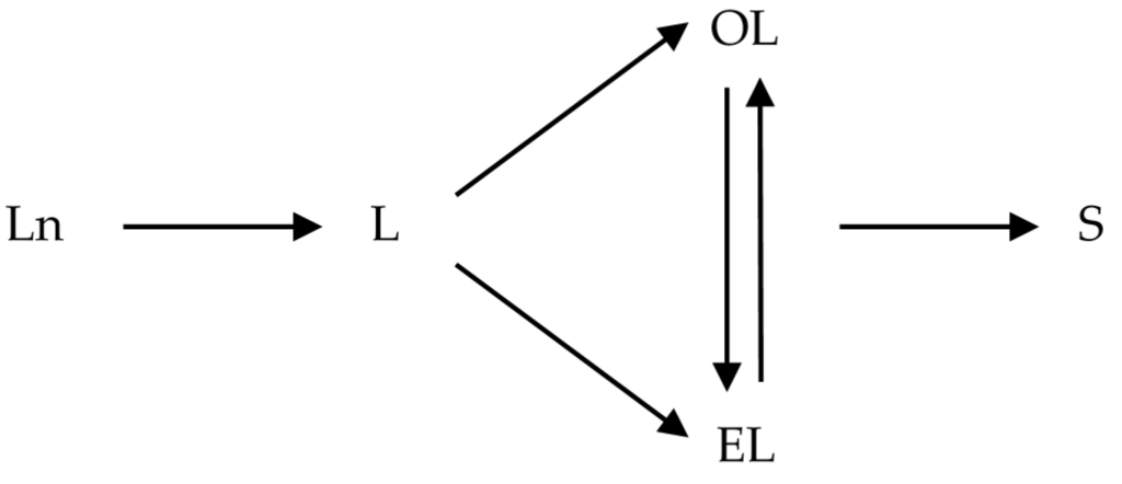 Simple hydrogenation model: Ln, L, OL, EL, S denote linolenic acid, linoleic acid, oleic acid, elaidic acid, and stearic acid, respectively.