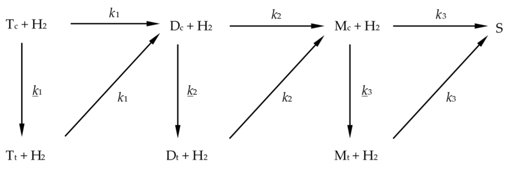 There are many factors affecting the course of hydrogenation, such as type and quality of oil, temperature, hydrogen pressure, catalyst type, catalyst loading, and stirring rate []. The effects of these process parameters on the activity and selectivity, especially towards trans fatty acids (TFA) formation have been widely reported [,,,,]. There have also been many attempts of modelling the nickel-catalyzed hydrogenation process of triacylglycerols in the literature and many invesigators have determined the overall reaction rate during hydrogenation [,,,,,]. The first and simplest kinetic model of edible oil hydrogenation, developed in 1949 by Bailey [], was based on three consecutive reactions of unsaturated fatty acids as presented in Scheme 1.