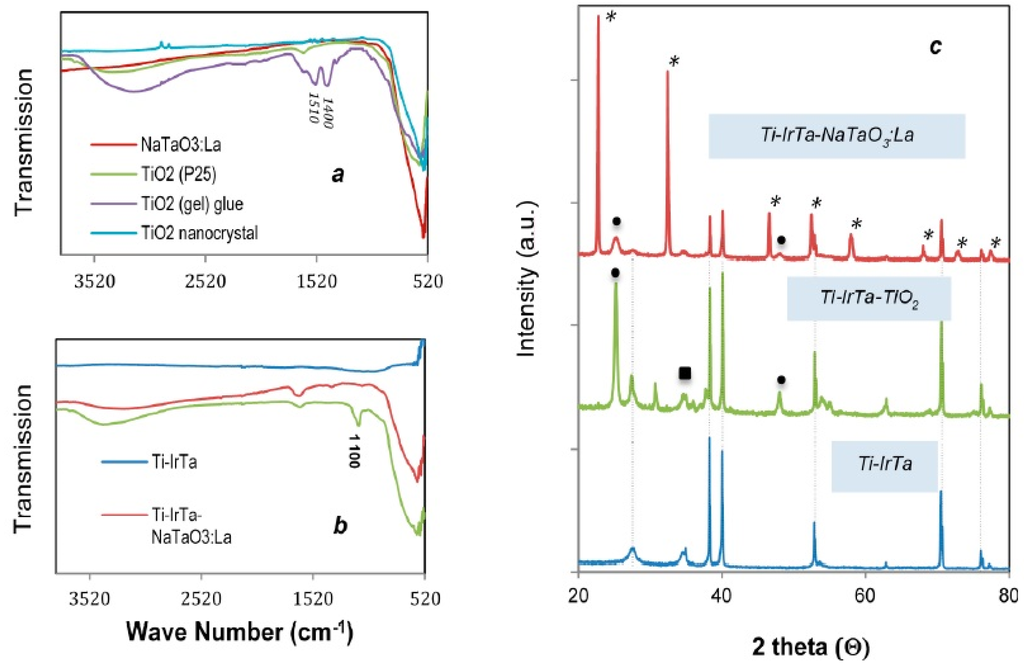 (a) FTIR spectra of the metal oxide powders used for fabrication of anode, TiO2 (P25), NaTaO3:La, TiO2 nanogel, and TiO2 nanocrystals. (b) FTIR spectra of the Ti-IrTa, Ti-IrTa-TiO2, Ti-IrTaTi-IrTa-NaTaO3:La anodes. (c) XRD spectra of Ti-IrTa-NaTaO3:La, Ti-IrTa-TiO2 and Ti-IrTa electrode. Ti-IrTa electrode pattern was dominated by the Ti foil XRD pattern due to the thin layer of of IrTaOx. XRD pattern of NaTaO3:La (*), an anatase phase of TiO2 nanogel (●), and a rutile phase from TiO2 (P25) (■).
