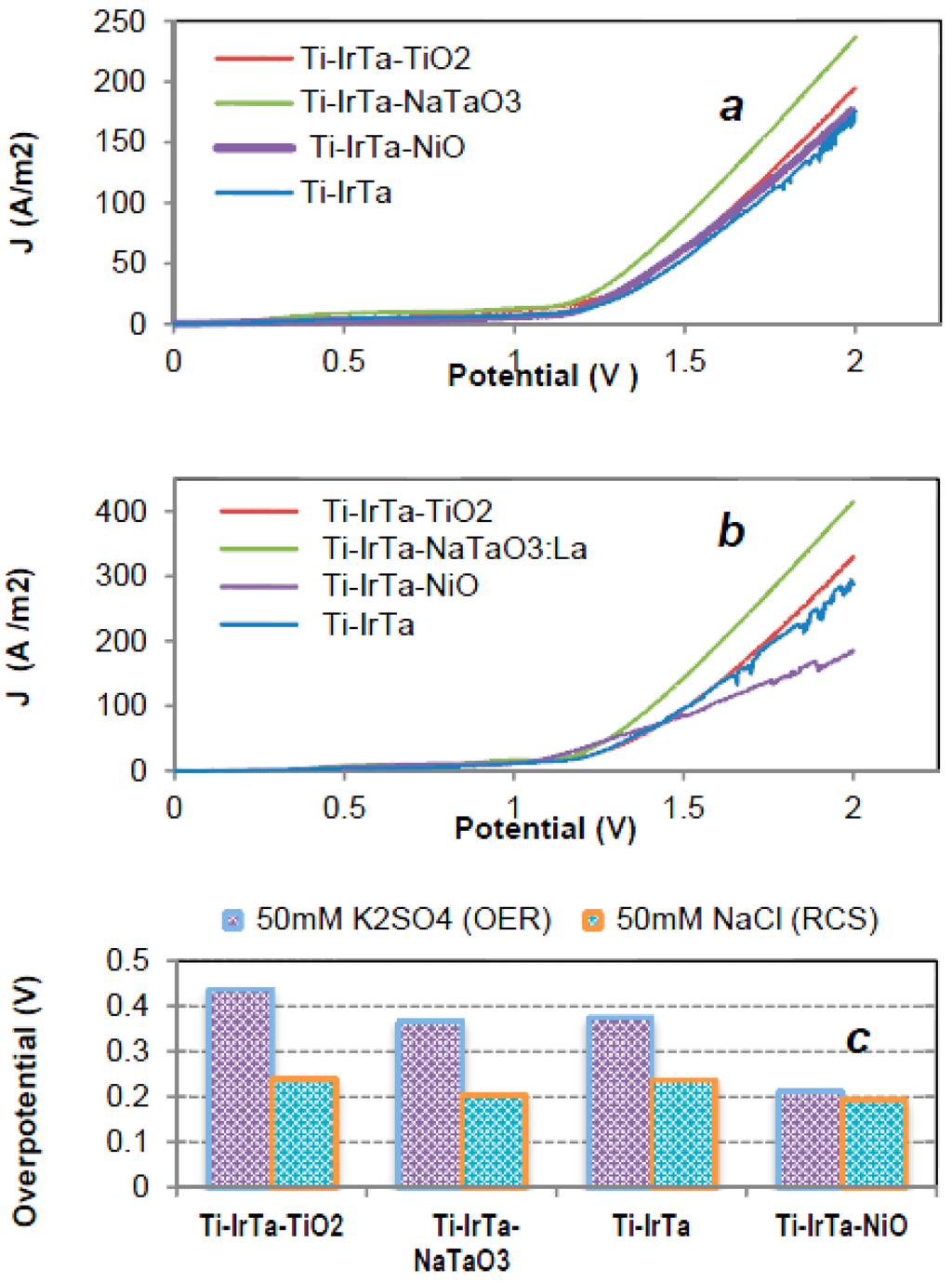 Cyclic voltammetry (CV) results for IrO2/Ta2O5 pre-coated anodes (Ti-IrTa), TiO2 over-coated anodes (Ti-IrTa-TiO2), and NaTaO3:La over-coated on IrO2Ta2O5 (Ti-IrTa-NaTaO3:La). (a) CV in a 50 mM NaCl solution; (b) CV in a 50 mM K2SO4 solution; and (c) the estimated overpotential obtained.