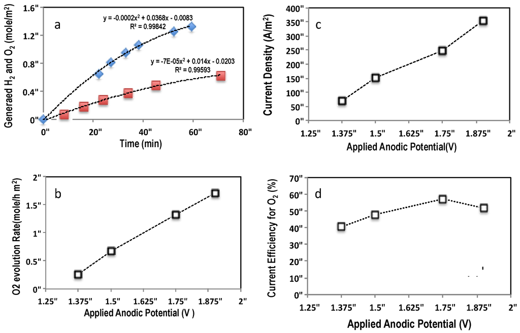 The generation rates for H2 and O2 were determined using 6 cm2 active surface areas for specific test anode and cathode. The Ti-IrTa-NaTaO3 anode was paired with a stainless steel cathode at a separation distance of 5 mm. Evolution rates were measured as a function of the applied anodic potential over the range of 1.35 to 2.0 V vs. SHE in a 50 mM K2SO4 electrolyte:(a) evolved H2 and O2 as measured simultaneously as a function of time at the 1.5 applied anodic potential; (b) O2 evolution rate; and (c) current density as function of applied potential; with (d) current efficiency for O2 evolution.