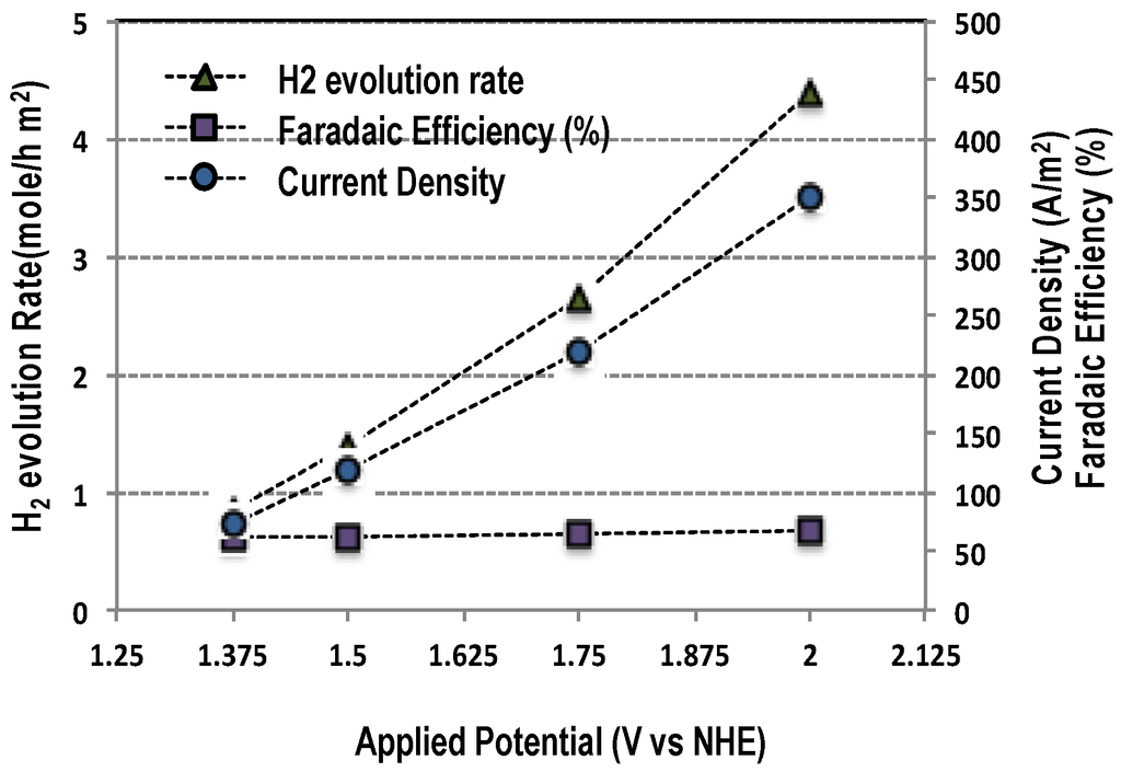 H2 evolution rates and associated faradaic efficiencies (HER) and current densities as a function of applied potential using the Ti-IrTa-TiO2 anodes (6 cm2) coupled with stainless steel cathodes with an electrode separation distance of 5 mm in a 50 mM K2SO4 electrolyte solution.