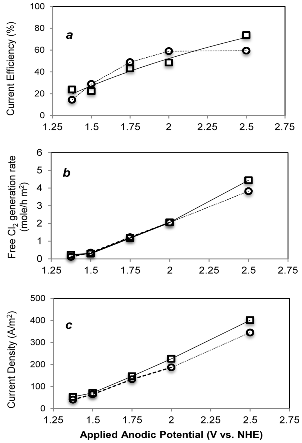 Comparative performance of the Ti-IrTa-TiO2 (○) and Ti-IrTa-NaTaO3:La (□) anodes coupled with stainless steel cathodes in terms of (a) current efficiency, (b) reactive chlorine generation rates, and (c) current density as a function of applied anodic potential during potentiostatic electrolysis of 50 mM NaCl solutions using the same cell dimensions and surface areas.