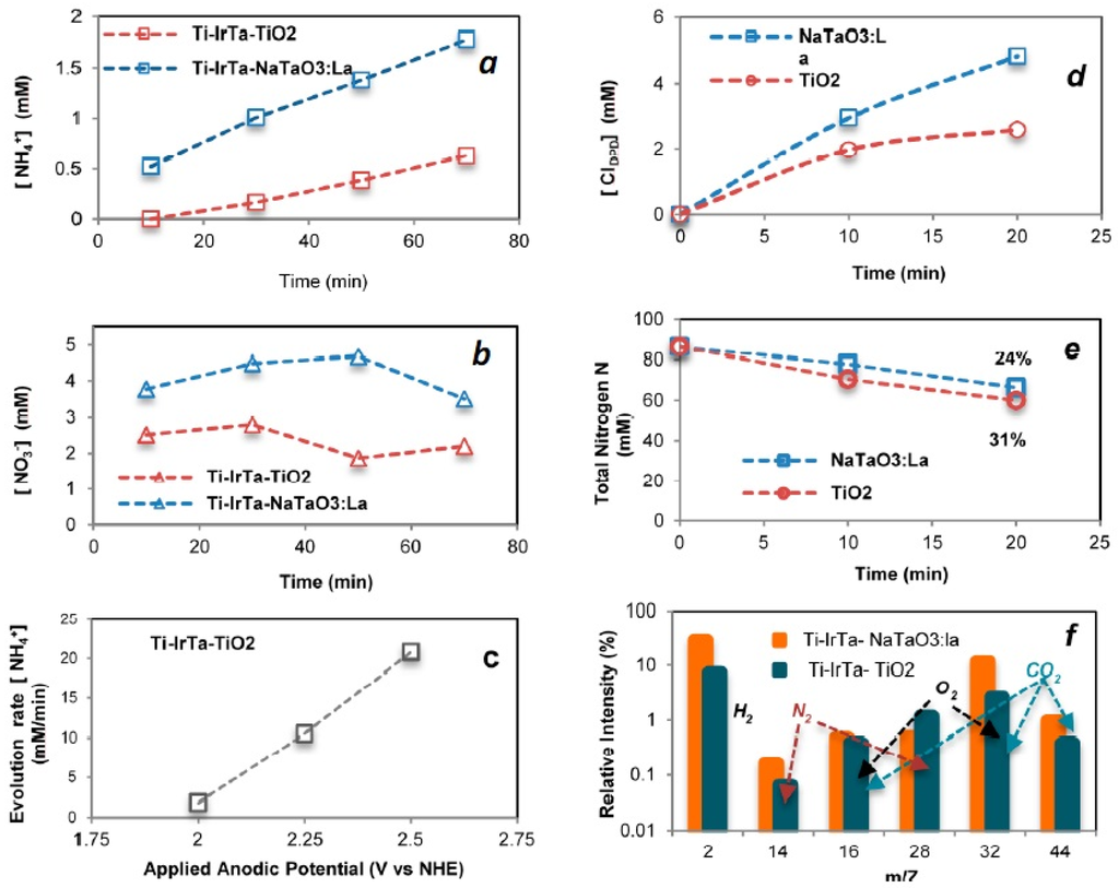 (a) [NH4+] and (b) [NO3−] versus time during the potentiostatic electrolysis of a solution containing 42 mM of urea and 50 mM NaCl in a volume of 70 mL for the Ti-IrTa-TiO2 and Ti-IrTa-NaTaO3:La anodes; (c) NH4+ production rate as a function of applied potential; (d) total chlorine production (ClDPD) at +2.25 V for Ti-IrTa-TiO2 and Ti-IrTa-NaTaO3:La; (e) [𝚺N]T vs. time; (f) head-space gas composition at an anodic potential of +3.25 V as determined by online MS.