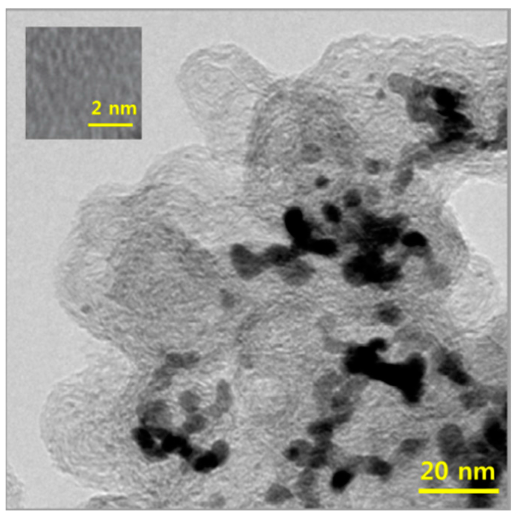 TEM image of carbon-supported Pt–BeO (the inset is the surface of Pt–BeO (1:11.5) on carbon support).