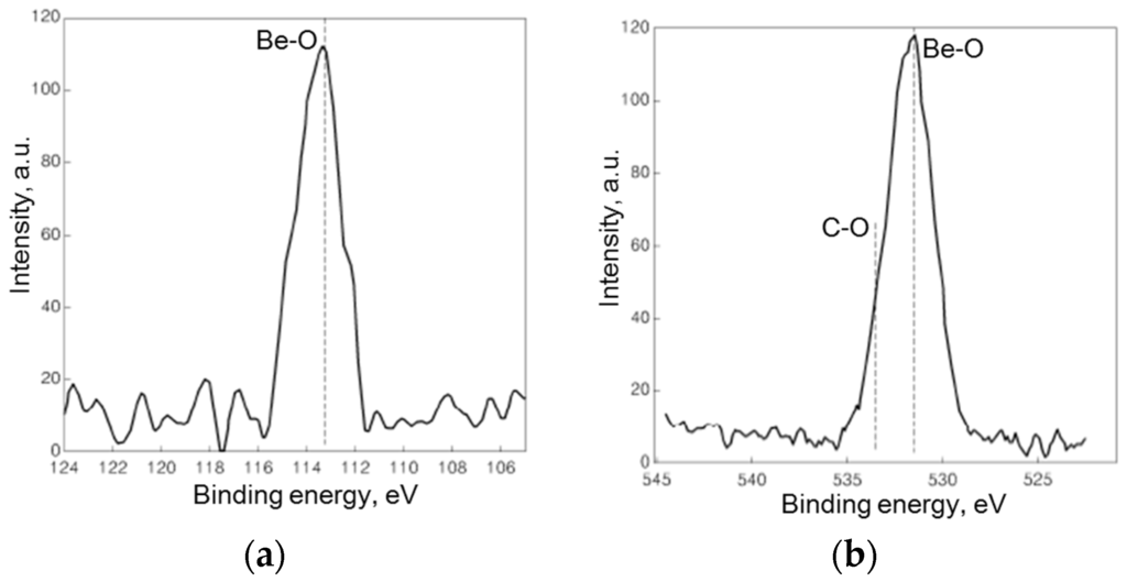 The XPS analysis in Figure 2 shows that a peak value of the binding energy of Be matches that of beryllium oxide, and oxygen can be bound with Be or carbon. This could indicate that Be exists as an oxide rather than forming an alloy with Pt.
