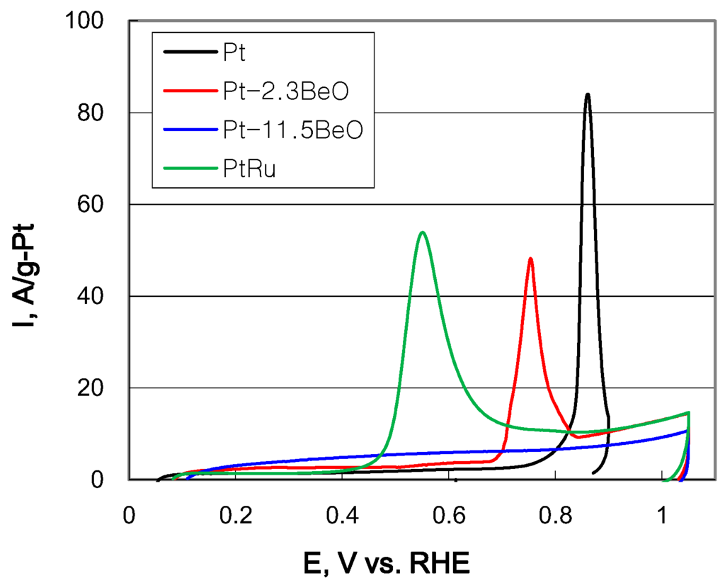 Figure 5 is a CO stripping voltammetry result, which compares the CO tolerance of carbon-supported Pt, Pt-2.3BeO, Pt-11.5BeO, and PtRu. Initially adsorbed CO on the catalysts at 0.05 V is oxidized by increasing potential, and their oxidation peak or onset potentials are compared. First, Pt shows a peak oxidation potential around 0.85 V, which is a similar value to Schmidt et al. [], and that of Pt-2.3BeO is ~0.75 V, which is lower than the peak oxidation potential of Pt by 100 mV. However, Pt-11.5BeO with excessive BeO has no oxidation peak, which would indicate that there are no available Pt sites for CO adsorption, resulting in absent CO oxidation peaks. On the other hand, the oxidation peak potential of a commercial PtRu is measured to be 0.55 V, which is the most CO-tolerant among the samples. Although Pt–BeO is not so CO-tolerant as PtRu, it is evident that an addition of an optimum amount of BeO to Pt makes Pt–BeO CO-tolerant compared to Pt.
