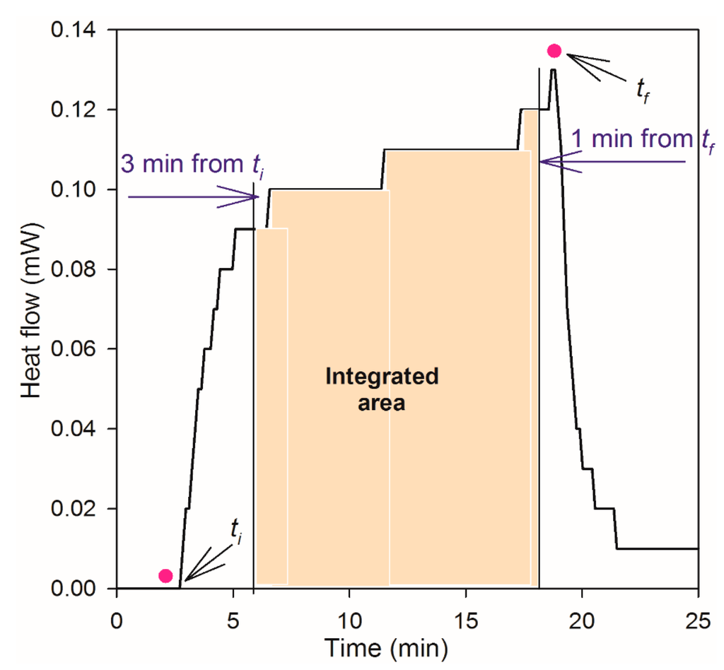The heat flow signal from the TPD experiment as a function of time is presented in Figure 1c. Heat flow was immediately observed when the sample was exposed to 50 ppm NO with a maximum exotherm of 0.13 mW. After being exposed to NO, the catalyst was flushed with Ar and a small heat flow was observed corresponding to the amount of NO, which is re-adsorbed during the second NO readsoption. Figure 3 shows the enlarged heat flow measured during the first 30 min of the first NO exposure (see Figure 1). The details used for the calculation of the adsorption heat are schematically shown in Figure 3. The initial time (ti) is taken into account when the catalyst is exposed to 50 ppm NO, while tf represents the highest point of heat flow, just before the catalyst becomes saturated and heat flow decreases. During the first few minutes the heat flow rapidly increased and the data in this region are highly influenced by the transient response behavior of the calorimeter. Therefore, the middle region of the heat signal is used to determine the heat of adsorption. More specifically, we chose 3 min after ti and 1 min before tf for the measurement time interval. During this time interval there was total uptake of the adsorbate and the heat flow, since it varied slightly, was integrated to calculate the heat of adsorption. The heat signal varied only about 0.03 mW during the measurement time interval. This indicates that the gas flows through the catalyst bed in a near plug flow manner, first saturating the front of the bed with adsorbate and, thereafter, the adsorption front moves through the catalyst bed [].