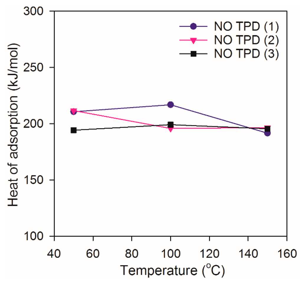 The heat of adsorption (in kJ/mol) of NO at adsorption temperatures 50 °C, 100 °C, and 150 °C are displayed in Figure 4. Moreover, there are some variations between individual tests, likely due to the very small heat release (in the range of 0.1 mW) and the experiments were, therefore, repeated to increase the accuracy. At 50 °C, 100 °C, and 150 °C, the respective average heats of adsorptions are 206, 204, and 195 kJ/mol, with corresponding standard deviations of 9.8, 11.2, and 2.6 kJ/mol. Thus, the NO heat of adsorption was quite constant in this temperature interval. It should be noted that, for the adsorption temperature of 150 °C, N2 production was observed during NO adsorption period and this means that the heat of adsorption measured is a combination of adsorption heat for NO, dissociation of NO and formation of N2. This could be the reason for that this adsorption heat being slightly lower than the others. For adsorption temperatures of 50 °C and 100 °C the values are very similar (206 and 204 kJ/mol). Our results on supported platinum on alumina are in agreement with heat of adsorption measured over single-crystal platinum surfaces, where Fiorin et al. [] reported values of 182 kJ/mol on Pt (111) and 192 kJ/mol on Pt (211). However, the values found by Wartnaby et al. [] for NO on Pt (110) is slightly lower (160 kJ/mol).