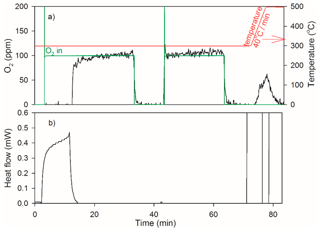 (a) Oxygen concentration and temperature as a function of the time and (b) the corresponding heat flow during O2 TPD at 300 °C for 2 wt. % Pt/Al2O3. Experimental details are described in Section 3.