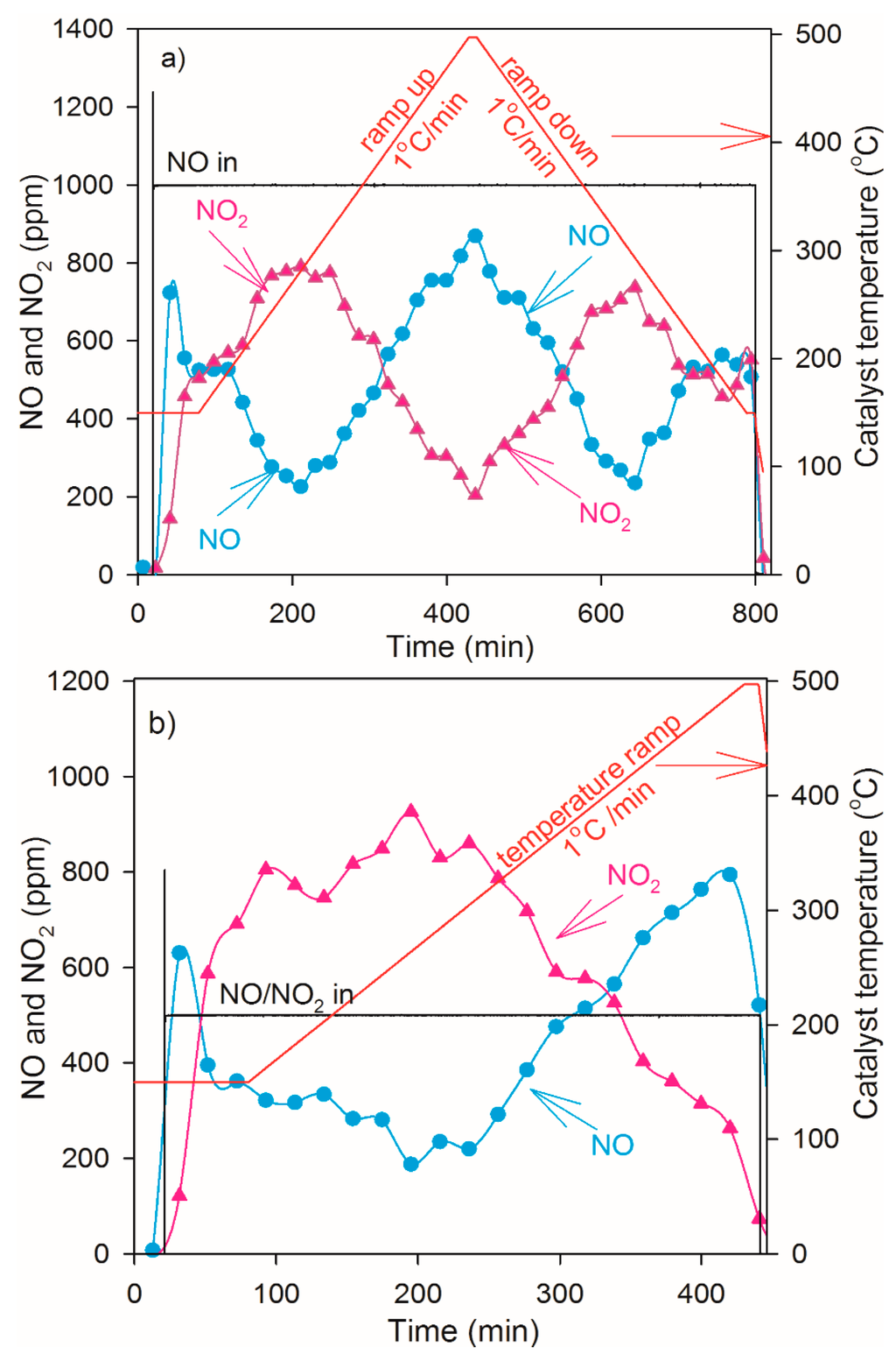 NO oxidation on supported platinum is investigated in this study first with only NO and O2 as reactants. The increase in NO2 concentration followed by its decrease and opposite trend for NO concentration during a temperature ramp from 150 °C to 500 °C (ramp 1 °C/min) is shown in Figure 8a. The reason for the observed decrease in NO oxidation at higher temperatures is due to thermodynamic equilibrium []. The results clearly show that the catalyst is active for NO oxidation. Regarding the NO concentration profile, when NO and O2 are simultaneously dosed into the system, there is a short initial overshoot of NO during the first minutes of the experiment (Figure 8a). The reason for this is probably NO formation during the storage of nitrates from the NO2 produced, according to: