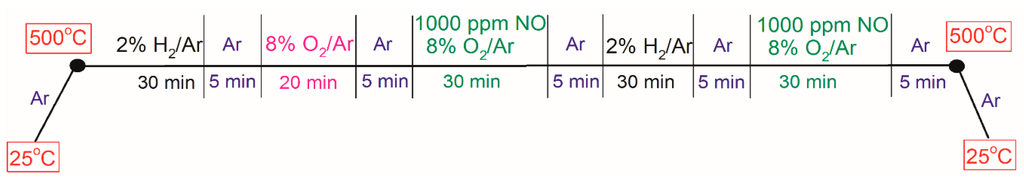 The degreened catalyst was subjected to various transient experiments: O2 TPD at three different temperatures (200 °C, 300 °C, and 400 °C), with NO TPD at 50 °C, 150 °C, and 150 °C. The samples were pre-treated using to 2% H2 at 500 °C for 20 min. After pre-treatment, the catalysts were exposed to 100 ppm O2 at the target temperatures (200 °C, 300 °C, or 400 °C) in two steps: in the first step the samples were exposed to oxygen for 30 min followed by an inert period for 10 min; in the second step the catalysts were flowed with oxygen for 20 min. Thereafter, the temperature was raised to 500 °C at a ramping rate of 40 °C·min−1 in an Ar stream. The NO TPD tests were performed in the same way as for O2 TPD, but using 50 ppm NO in the storage phases instead. The NO TPD experiments were conducted at three temperatures: 50 °C, 100 °C, and 150 °C, respectively.
