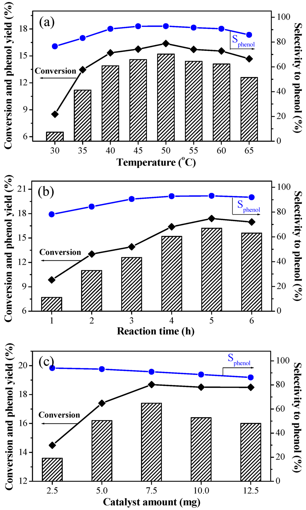 - Guo, C.; Du, W.D.; Chen, G.; Shi, L.; Sun, Q. Influence of temperature on hydroxylation of benzene to phenol using molecular oxygen catalyzed by V/SiO2. Catal. Commun. 2013, 37, 19–22. [Google Scholar] [CrossRef]