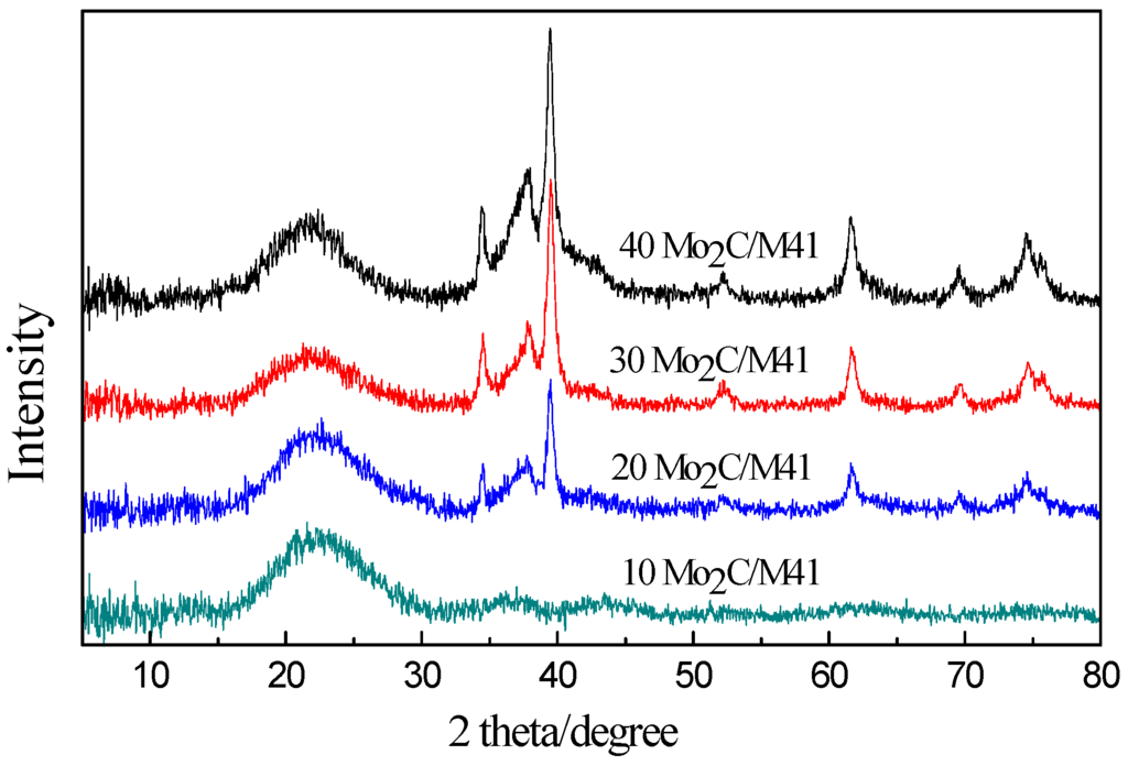 The XRD patterns of the yMo2C/M41 samples with different Mo2C loadings are shown in Figure 1. Several peaks that were located at 2θ = 34.4°, 38.0°, 39.4°, 52.1°, 61.5°, 69.5°, and 74.6° were assigned to the β-Mo2C phase with a hexagonal closest packed (hcp) crystal structure, and the peak located at 2θ = 15°–30° was attributed to the MCM-41 molecular sieve phase. However, for the 10Mo2C/M41 sample, the characteristic diffraction peaks corresponding to β-Mo2C were not observed, which may be due to the high dispersion of the Mo2C particles on the support. In addition, the intensity of the diffraction peaks corresponding to β-Mo2C became more intense as the Mo2C loading increased, which indicated that the crystallite size or crystallinity of β-Mo2C increased.