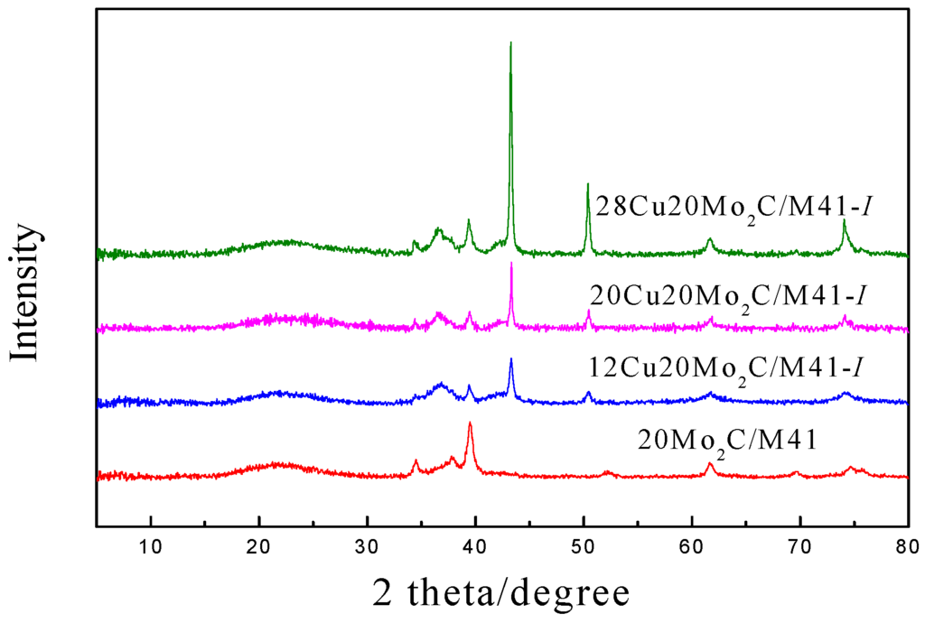 To improve the catalytic performance of 20Mo2C/M41, a series of xCu20Mo2C/M41-I catalysts with different Cu loadings (12%, 20% and 28%) were prepared using the co-impregnation method, and the XRD patterns are shown in Figure 2. Except for several characteristic diffraction peaks corresponding to β-Mo2C phase, the peaks located at 2θ = 43.4°, 50.5°, and 74.2° were ascribed to Cu°. In addition, the peak located at 2θ = 36.7° corresponded to α-MoC1−x. These results indicated that the Cu promoter had a substantial effect on the crystal phase of molybdenum carbide [26,40]. As the Cu loading increased, the intensity of the diffraction peak corresponding to the Cu° phase increased (Figure 2), which indicated that the crystallite size of Cu increased. This result is in agreement with the average crystallite size of Cu° in xCu20Mo2C/M41-I (Table 1).