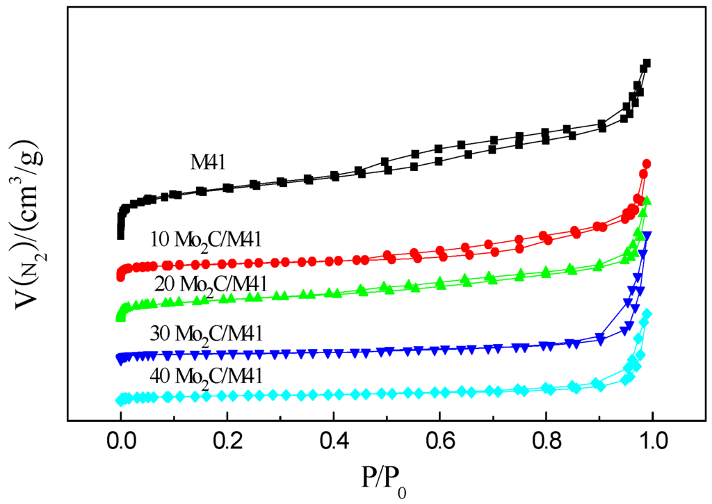 N2 adsorption and desorption isotherms of the yMo2C/M41 samples.