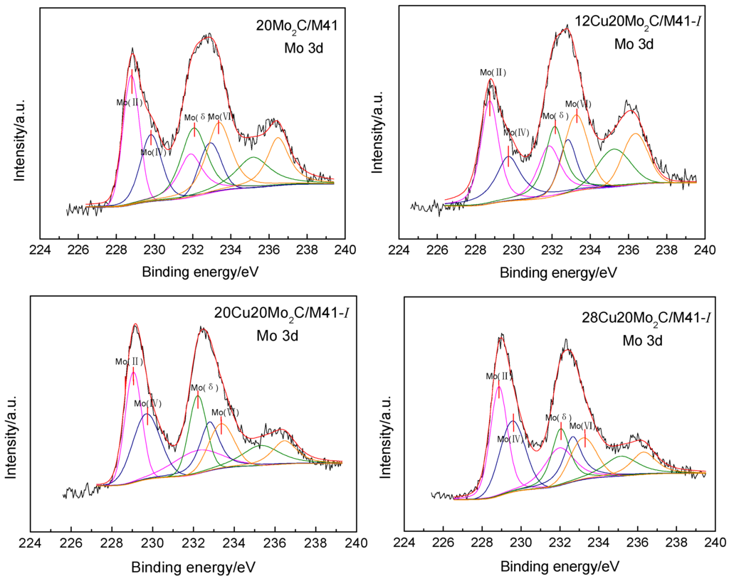 The X-ray photoelectron spectroscopy (XPS) analysis was carried out to elucidate the surface properties of the catalysts. The Cu and Mo surface contents for xCu20Mo2C/M41-I are listed in Table 3. As shown in Table 3, as the Cu loading increased from 12% to 20%, the surface Cu atom content increased. When the Cu loading was 20%, the surface Cu atom content was the highest (i.e. 43.8%). However, as the Cu loading continues to 28%, the surface Cu content decreased to 35.2% because Cu atoms agglomerated, leading to the formation of larger Cu particles that reduced the Cu content exposed on the surface of the catalyst. This result is consistent with the calculated average Cu crystallite size listed in Table 1.